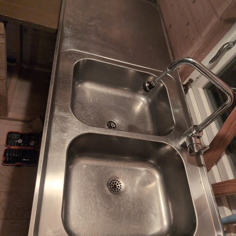 Diskbänk i rostfritt stål med dubbla hoar och avställningsyta