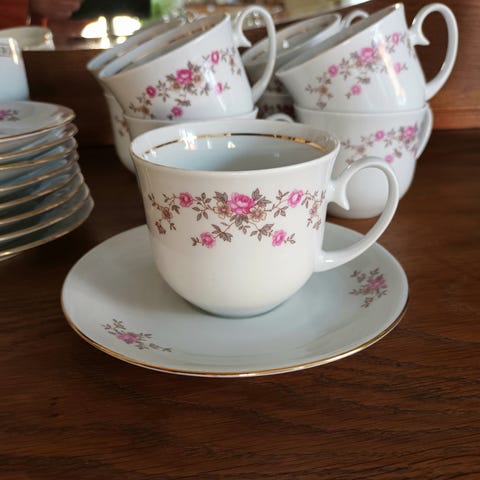 Set med kaffekoppar och fat.