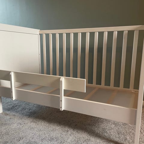 IKEA juniorsäng med integrerade lådor för förvaring. Sängen är utformad för barn och erbjuder en praktisk lösning med extra utrymme under sängen för att hålla rummet organiserat.