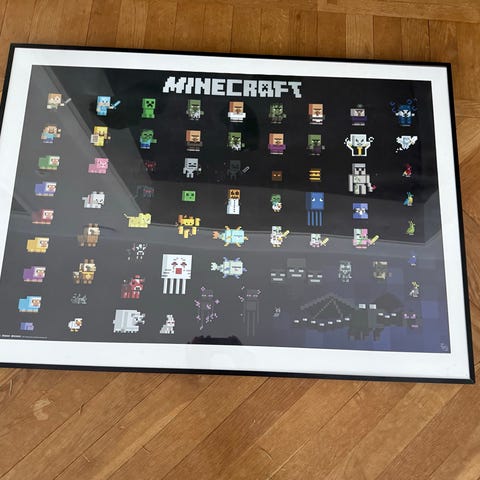 Minecraft konsttryck i ram med färgglad illustration föreställande en karaktär med djur och olika detaljer. Trycket är inramat och skyddat . I bta skick, storlek 70x100.
