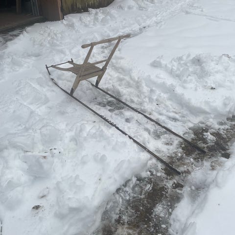 Träkälke - barnspark med metallbeslag och enkel sittbräda. Passar för barn och används för lek och transport på snö. Tillverkad i trä med metallförstärkningar.
