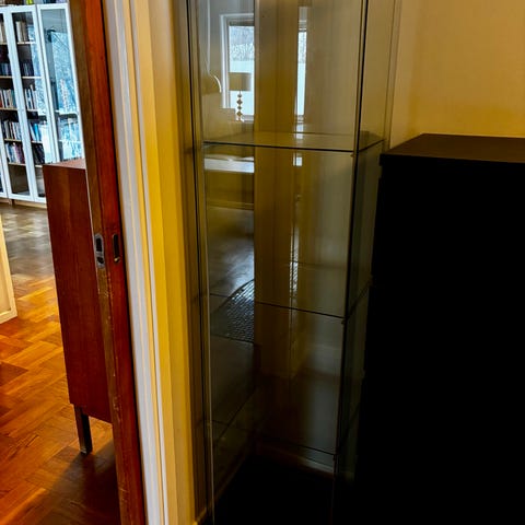 Vitrinskåp med belysning, går att dela i två separata delar. Väger totalt cirka 25 kilo.