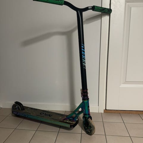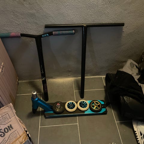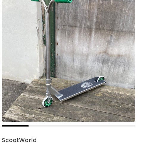 En kickcyckel som man gör tricks med. Den har robosta hjul.