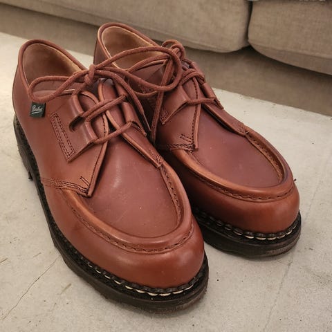 Paraboot Avignon i mörk cognacbrun grain. Skorna är i bra skick. Jag har precis bytt klackar och skoremmar. Skorna är använda i rotation med andra skor och därför i bra skick. De förvara alltid med skoblock i och är regelbundet underhållna. Det finns så klart spår av användning men jag lät skomakaren inspektera skorna när jag bytte klack och åtgärda eventuellt slitage som behövde åtgärdas. De är därför i bra skick. Storleken är 8 (42) och jag menar att de är true to size. Franska Paraboot tillhör de tillverkare som anses göra de bästa skorna i världen. Fantastisk kvalitet och passform.
