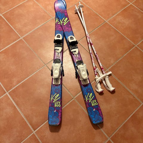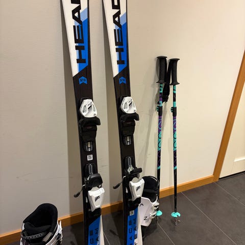 L skidor 117, längd stavar 95, strl pjäxor head 31,5-32. Finns även Salomon 33,5 eu
