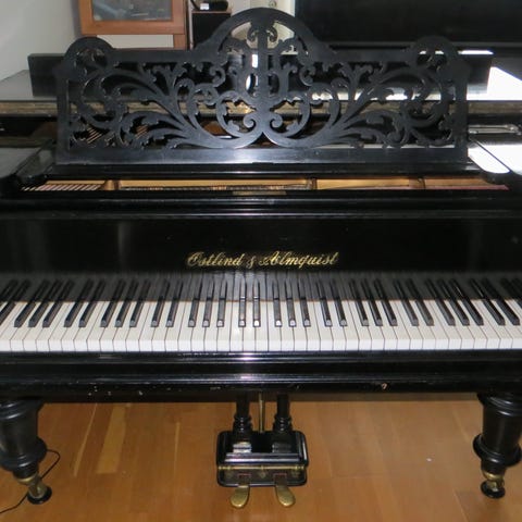 Orla Grand-500 elflygel med svart finish. Instrumentet har en klassisk design med tangenter och en stor kropp som liknar ett flygelpiano.