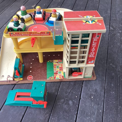 Fisher Price Stad med olika byggnader och tillbehör i plast. Vintage. Setet inkluderar flera ”kontor”, fordon och figurer som kan användas för lek och samling. Allt fungerar som i ursprungligt skick. Affär, post, fängelse, verkstad, brandbil, sirén i brandstationen mm. Massa tillbehör. Dock saknas någon gubbe (kanske hittas senare).