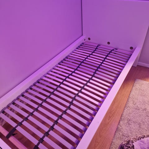 Sängen är i fint skick, finns ett märke som sitter ej synligt när den är monterad. Madrassen har en fläck.
