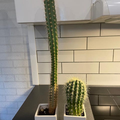 Stor kaktus avsedd för inomhusbruk. Växten har flera långa, gröna stjälkar och är placerad i en kruka. Passar som dekorativ växt i hem eller kontor.