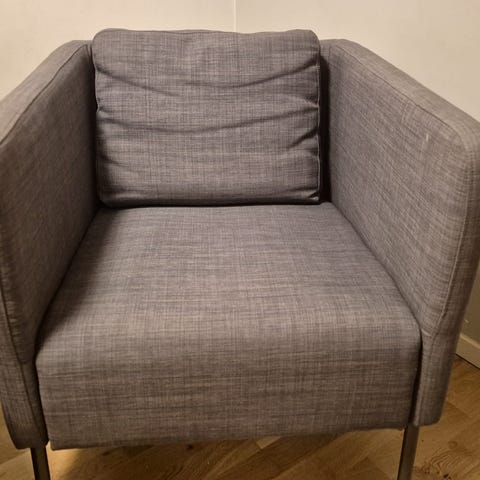 Säljer en fåtölj EJERSLEV med tillhörande fotpall i färgen grå med ekben, inköpt hos JYSK. Fåtöljen är några år gammal men i utmärkt skick.