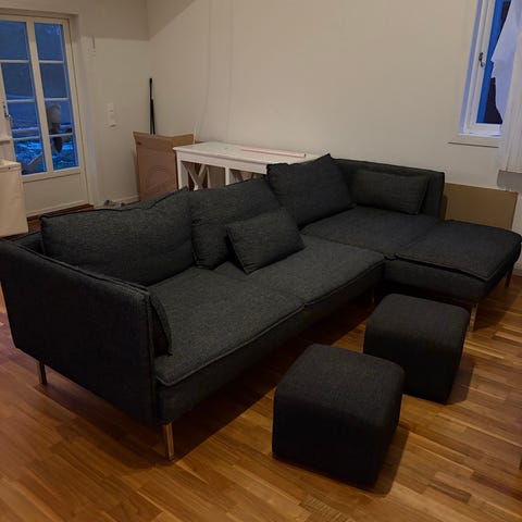 Skandinavisk hörnsoffa med divan utbytbart basfäste höger/vänster