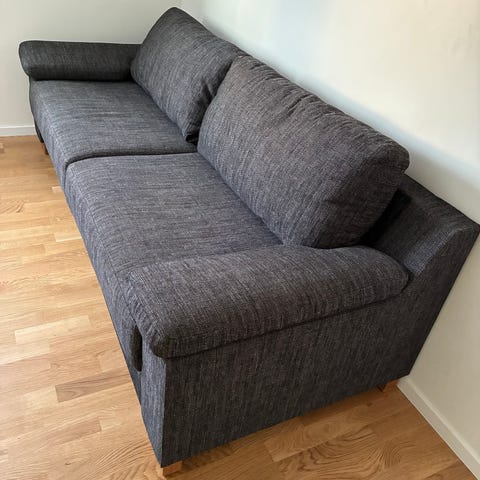Soffan är i bra skick men har fläckar i tyget som döljs lätt med kuddar.