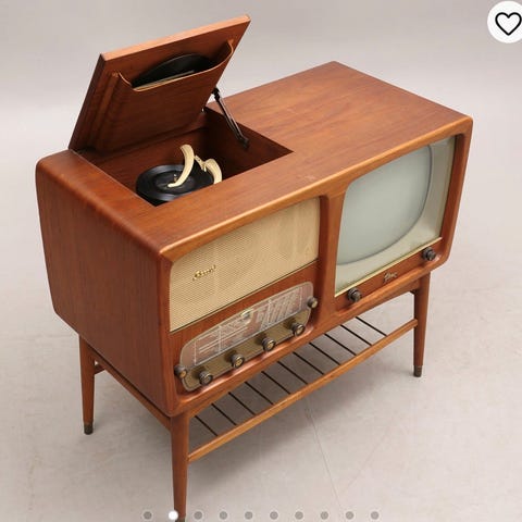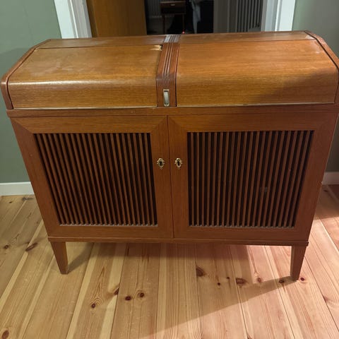 Fin och charmig retromöbel med radio och grammofonspelare! Ej funktionstestad på senare år. Radion har åtminstone funkat för några år sedan. Knapp saknas se bild. Överlag är möbleln i fint skick med tanke på ålder. Några skav finns, zooma i bilderna.