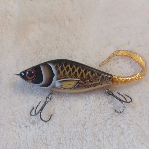 Strike Pro Wobblare fiskedrag med svart och grön färg. Utrustad med två trekrokar och en vit svans för rörelse i vattnet. Används för fiske.