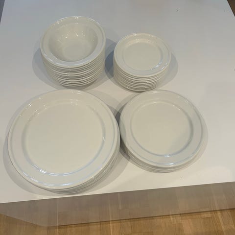 4 djupa stora, 5 djupa normalstora, 6 flata stora, 5 flata normalstora, 4 flata mindre, 4 uppläggningsfat