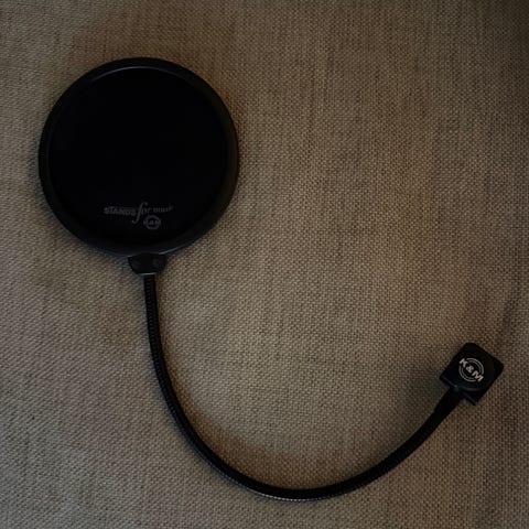 Dubbelt nylonnät med 200mm brett popfilter och 330mm justerbar arm. Klämman är 30mm och kan fästas på mikrofonstativ eller bord.