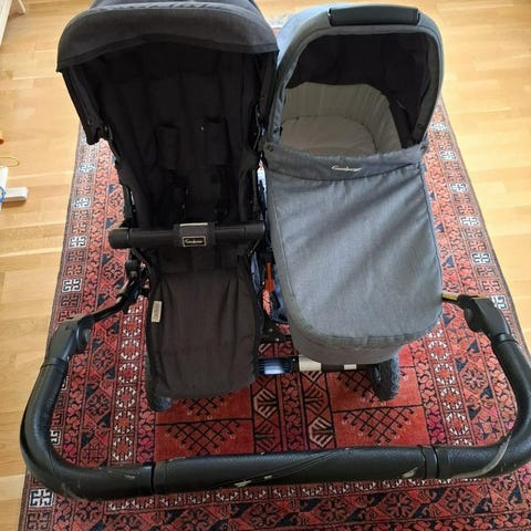 Säljer en Emmaljunga syskonvagn. Vagn med två sittdelar och liggdelar för tvillingar eller syskon. punkteringsfria däck. Passar för barn i samma ålder eller nära i ålder, lämplig för både stadsmiljö och lättare terräng.