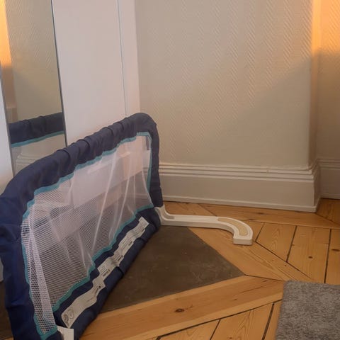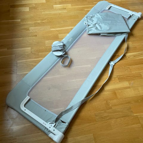 IKEA-tillbehör till barnsängar i vitt material. Passar som extra säkerhetsfunktion för barnsängar och hjälper till att förhindra att barn ramlar ur sängen.