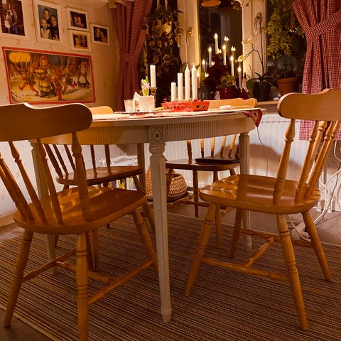 Matbord + stolar. Omklädda dynor. Fint skick, men finns något färgskav.