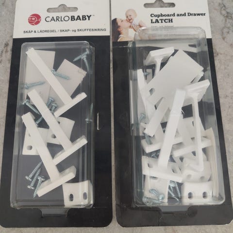 2 spärr för skåpdörr, 1 spärr för lådor och 2 dörrstopp (ikea patrull). Dörrstoppar är använd, de andra är nya.