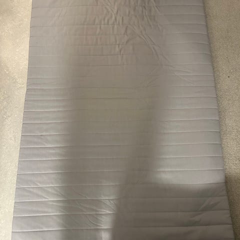 IKEA SULTAN madrass och sängbotten i trä. Madrassen är vit och har en enkel design. Sängbotten är i trä med ribbor för stöd. Produkten är anpassad för användning som sovplats.