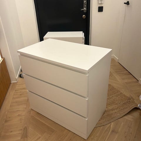 Har en vit MALM byrå med 6 lådor som jag skänker bort. Den har vissa defekter i en innerlåda (läckage, men påverkar ej lådans funktion eller yttre utseende).