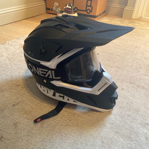 FXR Clutch är en hjälm designad för motocross och offroad-körning. Den har en blå och gul färgkombination och erbjuder skydd för hela huvudet inklusive ansiktet. Hjälmen är utrustad med ventilationsöppningar för bättre luftflöde och komfort under användning.Hjälmen är använd ett fåtal gånger och är i nyskick