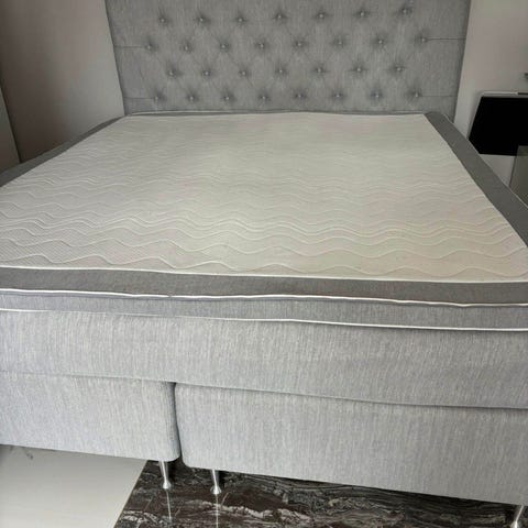 KungSängen exklusiv 180 cm kontinentalsäng i en grå färg. Vit bäddmadrass med grå och vit färg medföljer. Madrassen har en quiltad yta med knappar och är avsedd att användas som övermadrass. Sängben i ek, 10 cm följer också med.