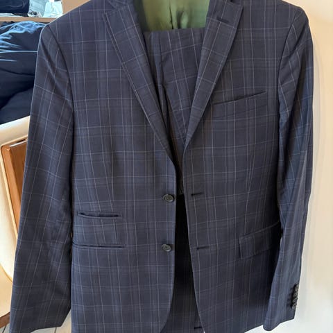 Kavajen är i storlek 46 och byxorna är i 48 för mer omfång. Passar till vardags som till fest. Fint skick.