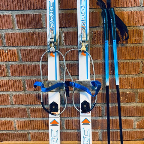 Skidor 130 cm, vallningsfria samt pjäxor storlek 33. Använda en gång. 250 kr för allt.