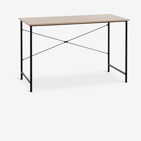Välvårdat vitt skrivbord med vita metallben och vit hurts. Hurtsen har en utdragbar låda och ett skåp med gott om plats för förvaring.