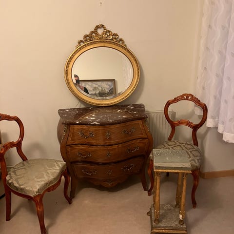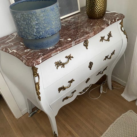 Byrå med marmorskiva och trädetaljer