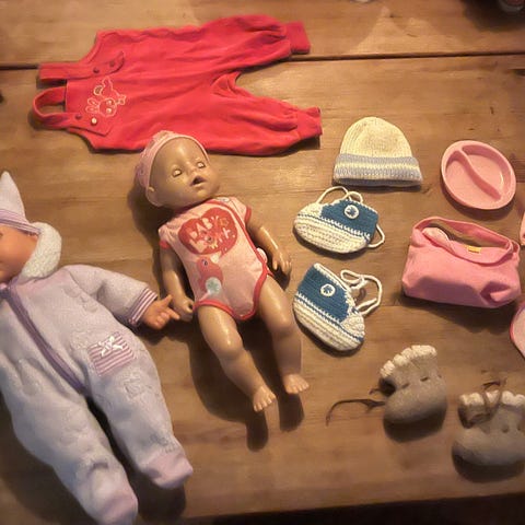 En samling dockkläder i olika storlekar, färger och mönster. Innehåller overaller, bodys, byxor, tröjor och klänningar i olika material och färger, inklusive rosa, rött, gult, grönt och mönstrade plagg. Passar bland annat Lillan och Skrållan dockor. Ni får allt för 250kr