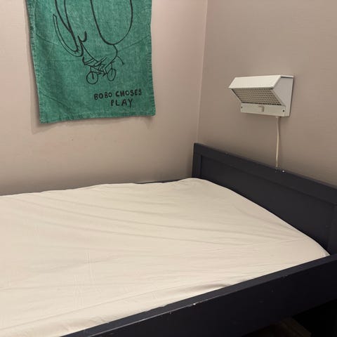 Sängen har en del klistermärken på sig och skavd, se bilder. Annars i ok skick för den som kanske vill måla den i egen färg.
