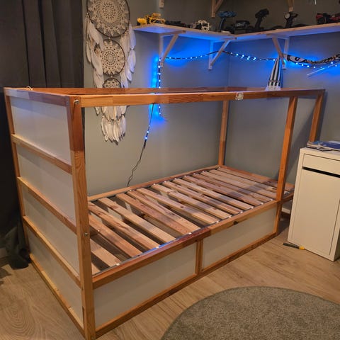 Vid köp av sängen saknades det några skruvar, varav vi har använt egna. Så för den händige att montera. Monteringsbeskrivning finns på IKEAs hemsida, sök på sängens namn.