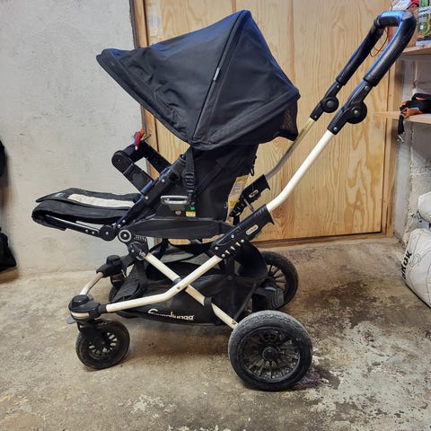 fyra hjul i svart färg. Två större hjul med luftfyllda däck och två mindre svängbara hjul med luftfyllda däck. Hjulens material är plast och gummi.