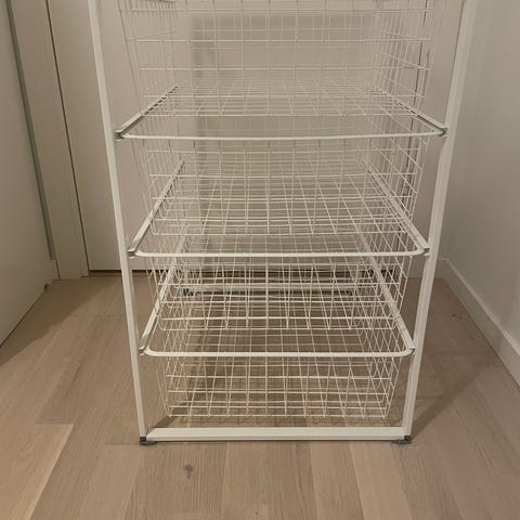 1 hyllplan, 2 utdragbara trådkorgar och 4 st skohyllan. Märken efter krok på vänster sida (se bild).