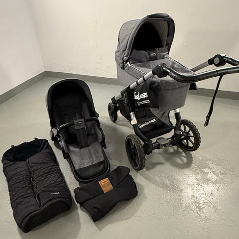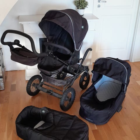 Kronan barnvagn i röd färg med avtagbar liggdel och sittdel. Barnvagnen har justerbart handtag och robust chassi med stora hjul, lämpad för olika terränger och väder. Passar för 0-6 år gamla barn.