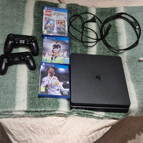 Sony Playstation 4 Slim inklusive två handkontroller och nödvändiga kablar för anslutning och laddning. Konsolen är svart med utrymme på 500gb. Original handkontroll har minimal stickdrift men kontrollen från tredjepart fungerar riktigt bra och köpt i oktober 2025.
