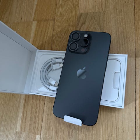 Apple iPhone 15 Pro Max med 256 GB lagringsutrymme. Mobiltelefon med stor skärm och flera kameror på baksidan. Telefonen har en mörk färg och metallram runt kanterna. Passar för användare som behöver mycket lagringsutrymme och avancerade kamerafunktioner.