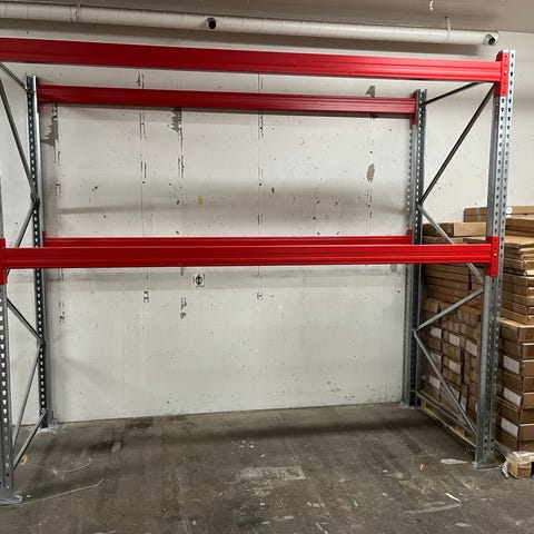 Hyllställ Lagerställ i metall, modell större. Används för förvaring och organisering av varor eller material i lager eller liknande miljöer. Mått 1,6m brett och 3,5m högt. 6st armar.