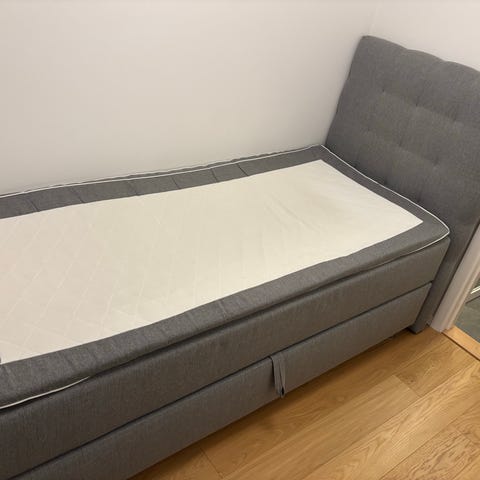 En riktigt fin 90x200 säng i grå sammet med sänggavel. Inga defekter, slitage eller hål.