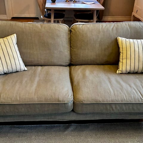 Hej! Vi säljer vår trevliga och bekväma Stocksund IKEA soffa. Tyget är avtagbart och tvättbart. Tyget är från början mörkgrönt men ganska blekt på olika ställen. Tygöverdraget är helt. Vi tror att det går att köpa nytt tygöverdrag på Ikea. Finns i rök- och djurfritt hem. Varmt välkomna att prova den!
