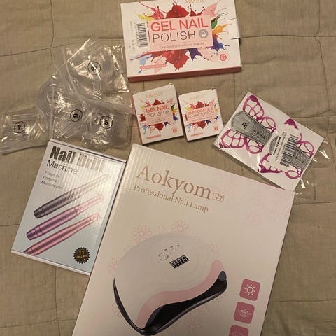 Säljer nu mitt nagelset, allt som är på bilden ingår plus ytterligare produkter. Uv/Led lampa med stark kapacitet, en laddningsbar elfil som har knappt använts med väldigt många "huvuden" till, professionella borsten för gel nagellack applicering, glitter, professionella nagelfil mm.