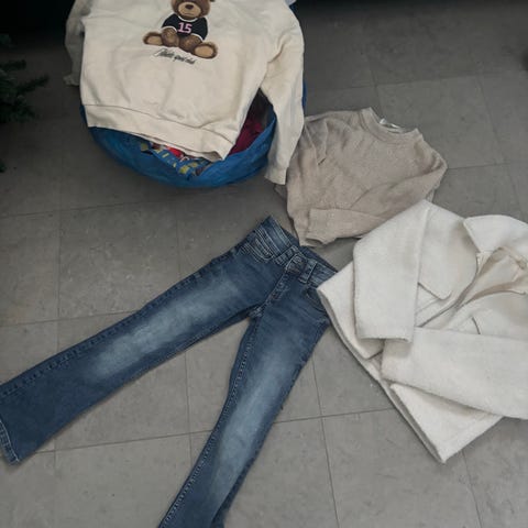 Två fulla påsar med kläder till flicka i 134-140. Vissa kläder mer använda än andra. Det är allt från byxor, tröjor, T-shirts, träningskläder, underställ.