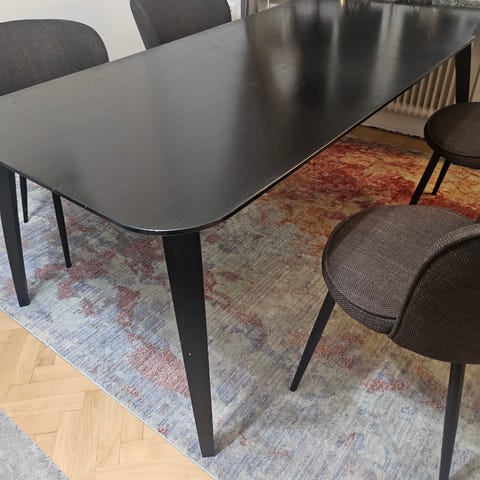 Otroligt fint rektangulärt bord i valnöt från gubi. Behöver oljas om pga solblekt men detta kan göras på egen hand enligt gubi(har deras svar på mail). Ett litet märke mitt på bordet ca 3-4 cm(se sista bilden). Finns i Stockholm centralt att hämta.