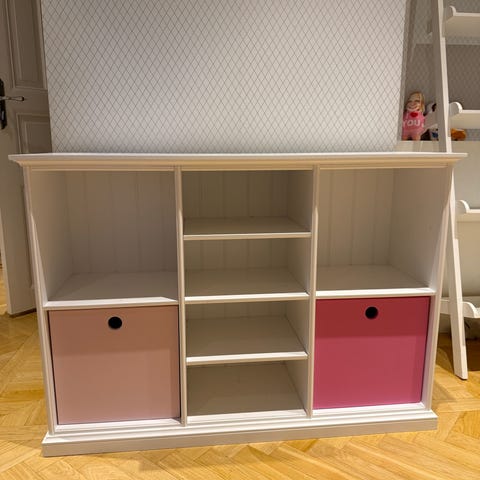 Oliver Furniture barnmöbel förvaring med öppna fack och tre lådor i ek. Möbeln är vit med lådor i ek och är avsedd för barnrum. Kan användas för organiserad förvaring av leksaker och andra barnartiklar.