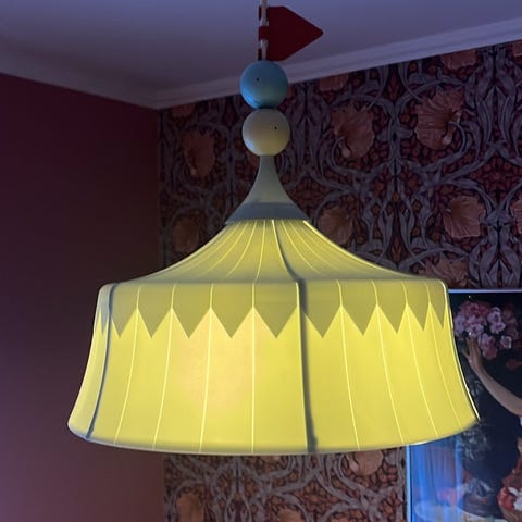 Lampa formad som en luftballong i rosa färg med dekorativa flaggor. 30 cm i diam."ballongen" är köpt, annars är allt gjort av mig. 5 m batterislinga. 🙂