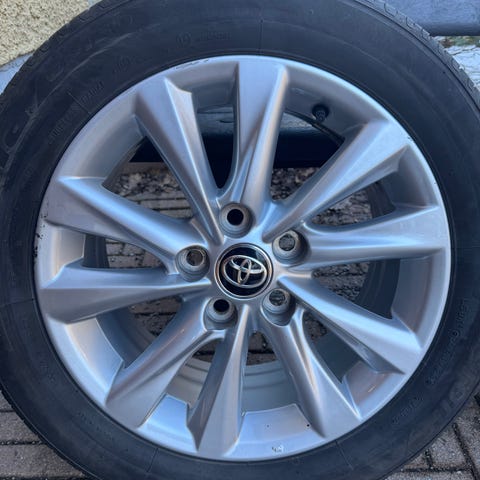 Vi erbjuder en fin och komplett uppsättning original Toyota aluminiumfälgar i 16 tum, monterade med premium sommardäck Michelin Primacy 4.