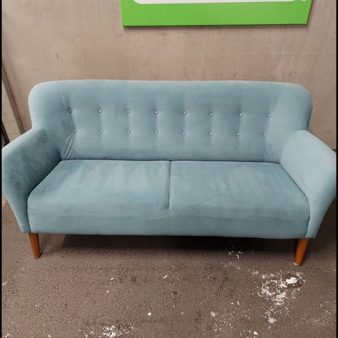 Retro soffa i rött grovt tyg och ljust trä. Troligtvis 60-tal. Hittar tyvärr inga stämplar eller märkningar. Katt finns i hemmet och bärhjälp finns.